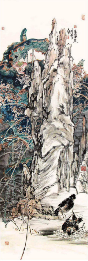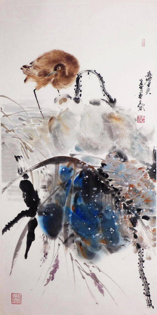 作品无论是谷穗松鼠、还是禽鸟荷花皆清新明丽,生动而自然,尤其是对一些动物的描绘更是活泼可爱,灵动传神。画面中始终洋溢着一股爽朗欢悦的气息。传造物的外在形貌特征和内在的精神气度于笔端,是国画家的必修课。而又能在笔墨传情的基础上另辟蹊径,以谷穗、荷花、以及各种动物为主要表现对象,且精于表现他所钟爱的这些题材,表明了画家对自我艺术特色与当代画坛整体发展趋势的洞悉与把握,其经验可资借鉴。
